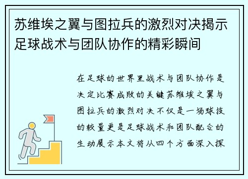 在现代足球中,战术与团队协作的结合越来越受到重视。在这场备受瞩目的比赛中,萨堡与海与松两队展开了精彩对决,通过各自独特的战术安排和团队配合,展现了足球运动的魅力。本文将从战术运用、团队合作、球员个人表现以及比赛结果四个方面,对这一对决进行深入分析,以揭示其背后所蕴含的足球智慧与魅力。这场较量不仅是一场技术和身体素质的比拼,更是对教练智慧和球队凝聚力的全面考验,为我们提供了深刻的思考和启示。 1、...