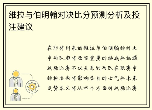 本文旨在对波兰与委内瑞拉之间的比赛进行深入分析,并对比赛结果及大小分进行预测。首先,我们将探讨两队的历史交锋记录以及球队近期表现,以便更好地了解双方的实力对比。其次,分析球员状态和战术安排是预测比赛走向的重要因素,因此我们会详细讨论各自主力球员的表现和可能采取的战术。接下来,将结合天气、场地等外部因素来评估其对比赛结果的影响。最后,通过综合以上因素,对比赛结果和大小分进行合理预测,希望能够为读者提...